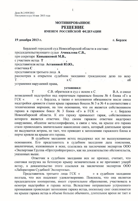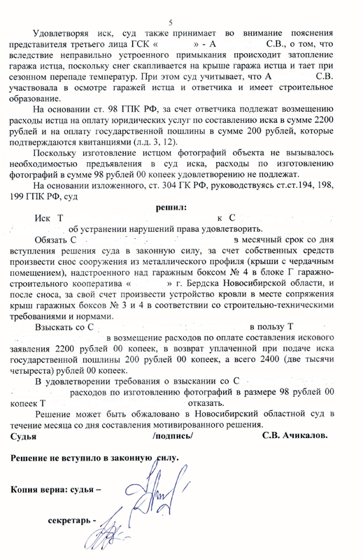 В интересах гр. Т. было составлено исковое заявление об устранении нарушенного права, путем сноса возведенного сооружения.