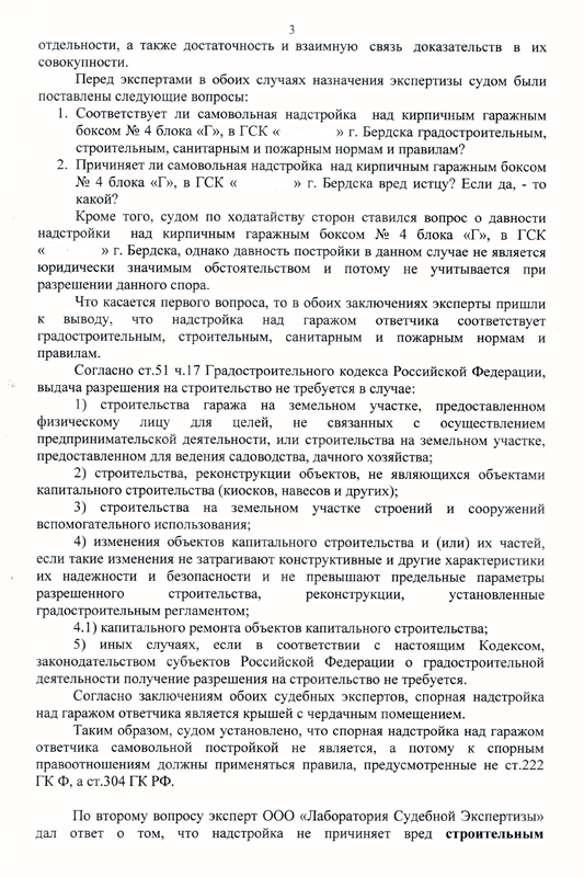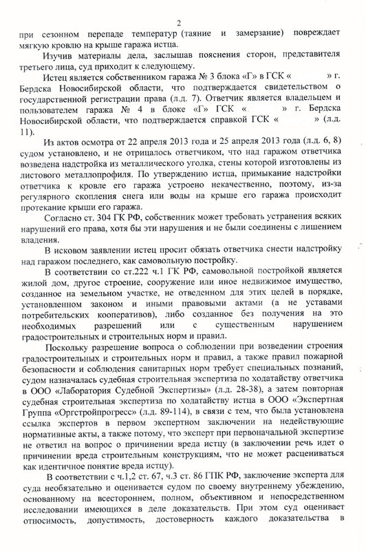 В процессе рассмотрения указанного искового заявления, по ходатайству сторон были проведены два экспертных исследования, на предмет соответствия возведенного сооружения над гаражным боксом строительным, санитарным, а также пожарным нормам и правилам.