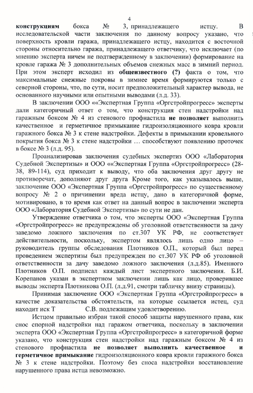 Гр. С. над своим гаражным боксом надстроил сооружение, обшитое металлопрофилем. В связи с наличием возведенной конструкции, на крыше гаражного бокса, принадлежащего гр. Т. стало происходить значительное накопление снега, что приводило к затоплению гаражного бокса и порче его кровли.